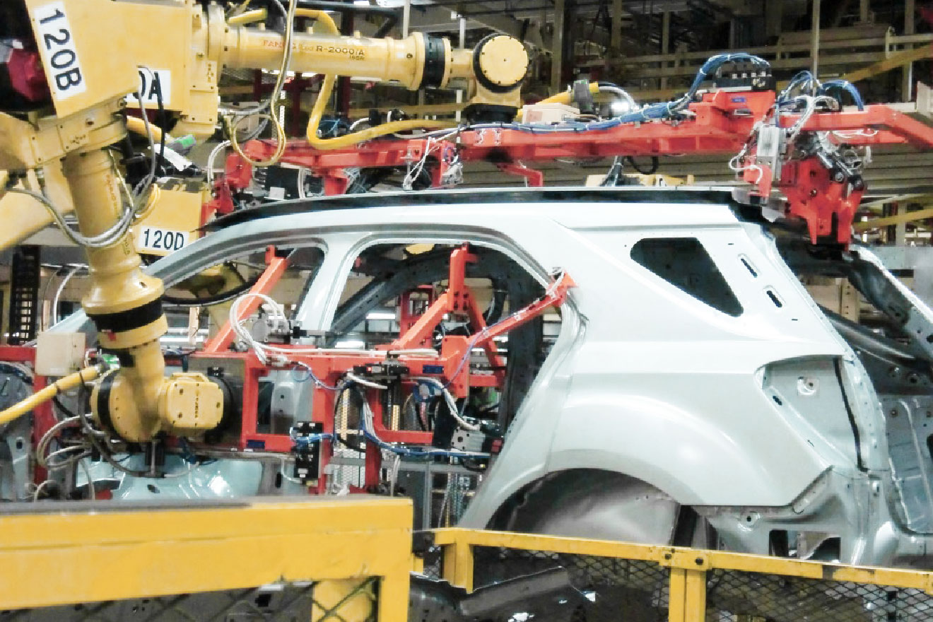 車はプレスショップ、ボディショップ、ペイントショップ、ジェネラルアセンブリーショップ(車両の最終組み立て工程)の4つの流れを経て完成するが、ボディショップは、いわば車の骨格をつくる全工程を指す。